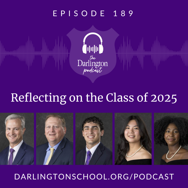 The Darlington Podcast is a collaboration between the communication and advancement teams, and is hosted by various members of the school community. Episodes are released biweekly on Thursday mornings and are available on most podcast platforms (search for The Darlington Podcast in your podcast player). Once new episodes are posted, you'll also be able to find them at www.darlingtonschool.org/podcast. Please subscribe wherever you listen to podcasts so that you'll get the latest episode!