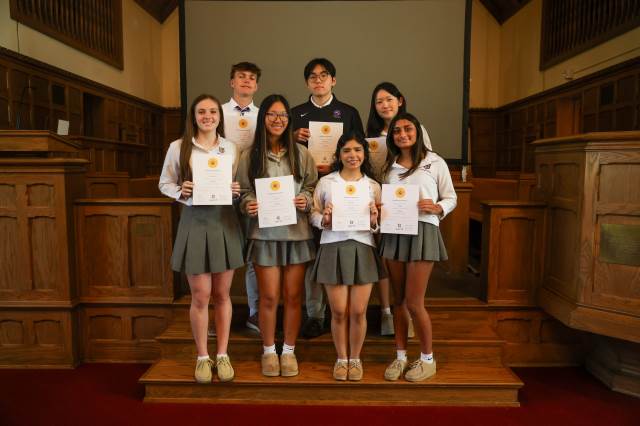 To be inducted into Sociedad Honoraria Hispánica, students must have completed three semesters of Upper School Spanish; currently have an average of 90 or higher if enrolled in AP Spanish/Spanish III Honors/Spanish II Honors, or an average of 93 or higher if enrolled in Spanish IV/Spanish III /Spanish II the semester of selection; and have maintained an overall average of 90 or higher in all Spanish courses. Inductees are selected by a committee of language teachers based on their current teacher's evaluation and the student's current and future language experiences.