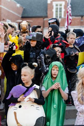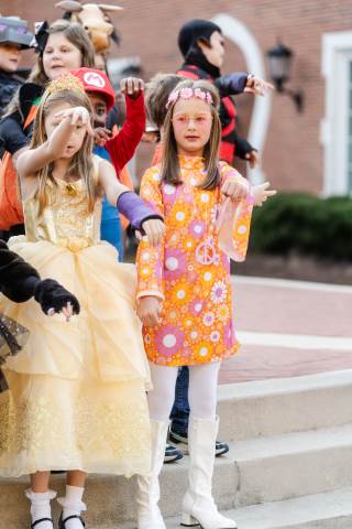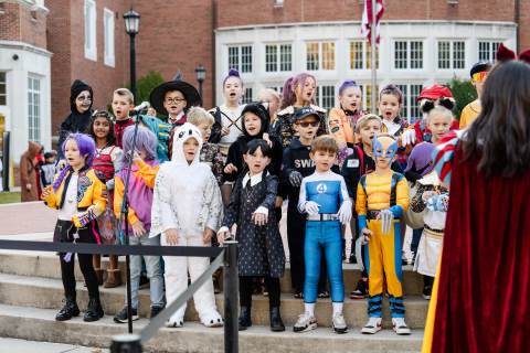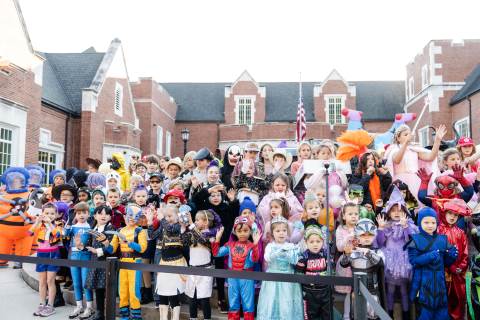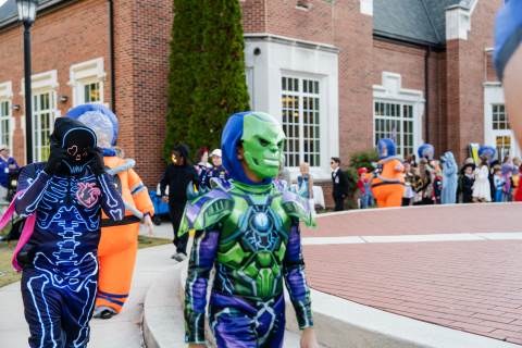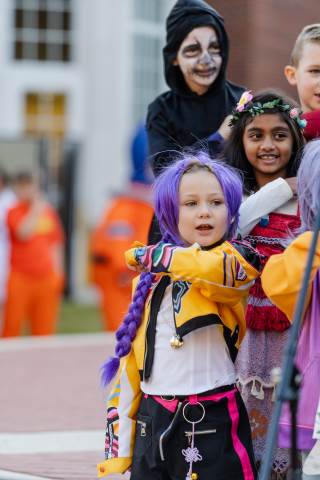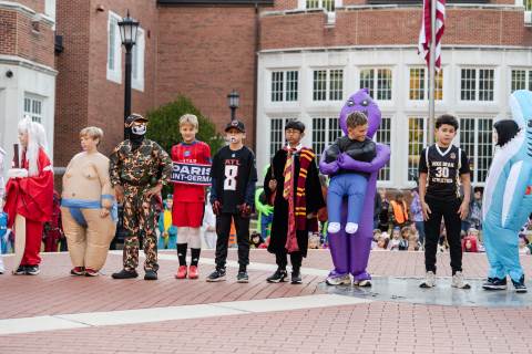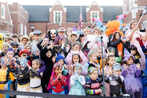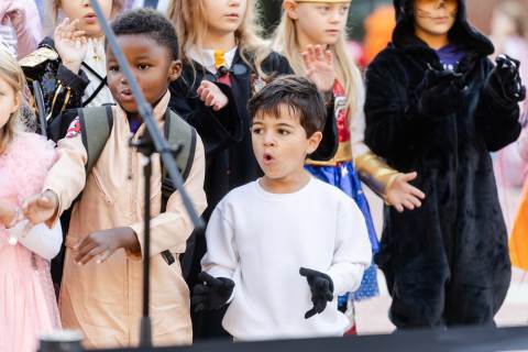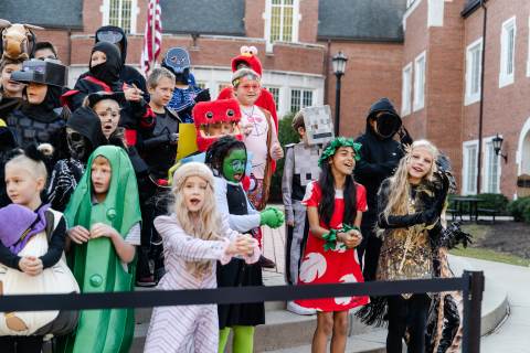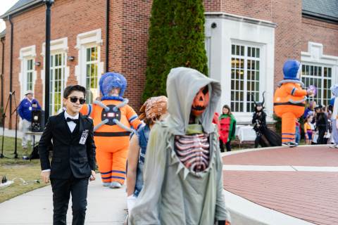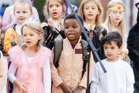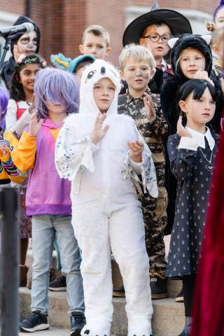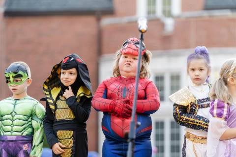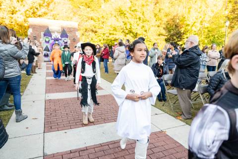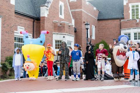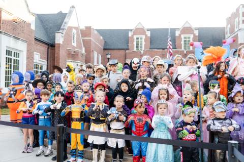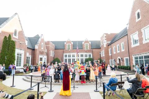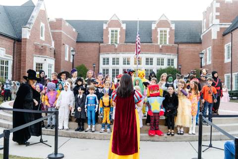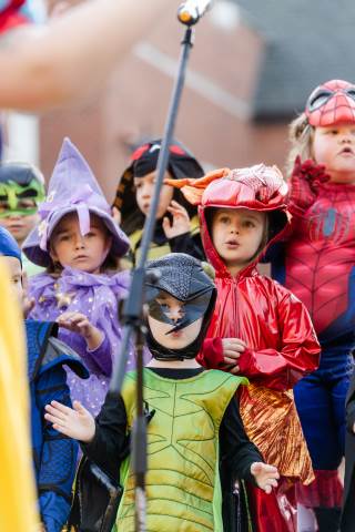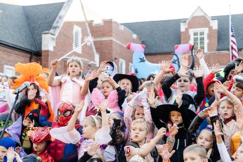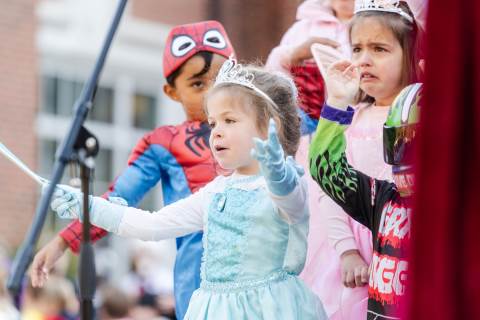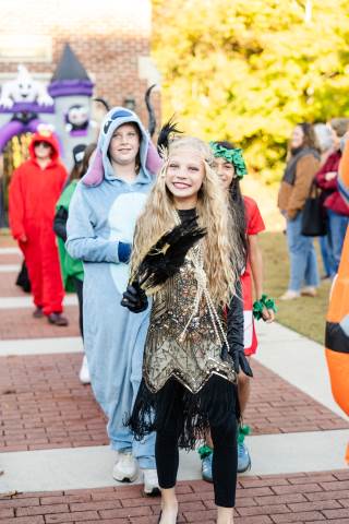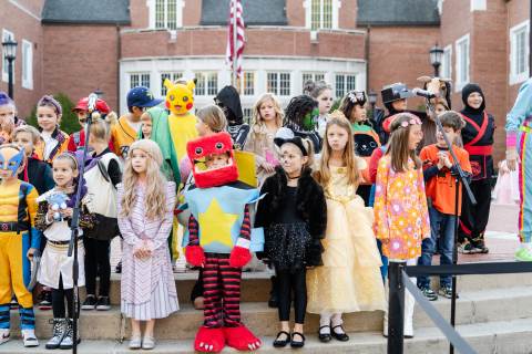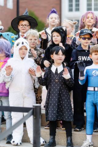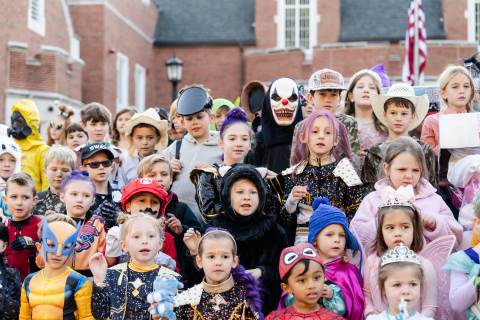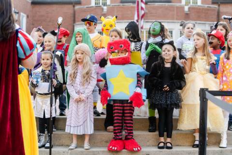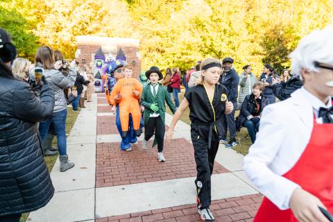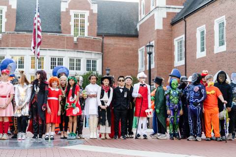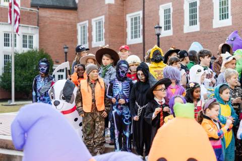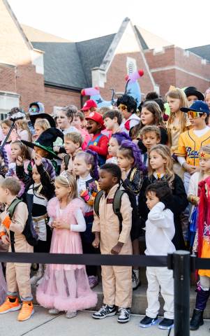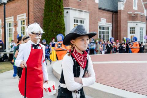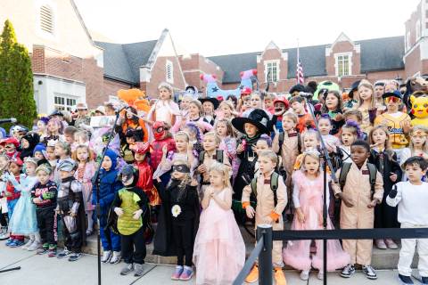 Students in grades pre-K to 5 show off their Halloween costumes at the annual parade before advisory groups representing grades 6-8 perform their skits for parents and special guests.
