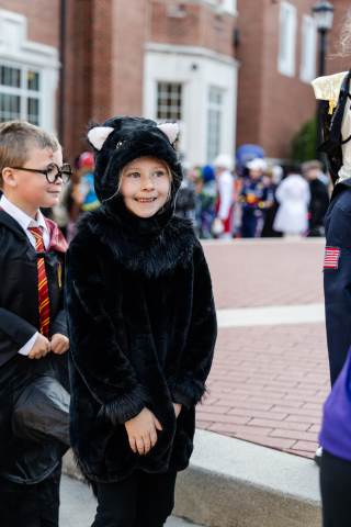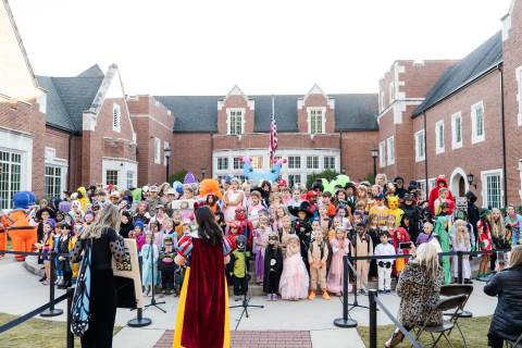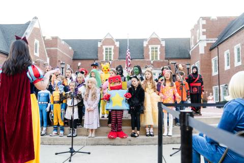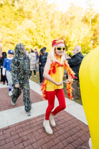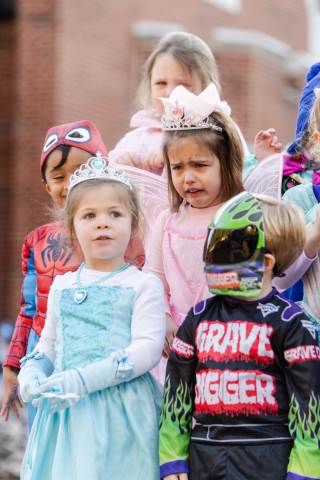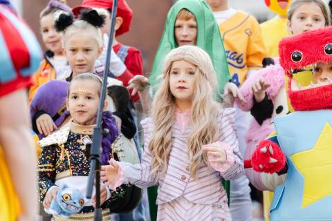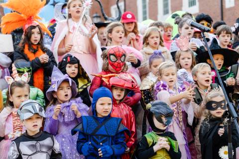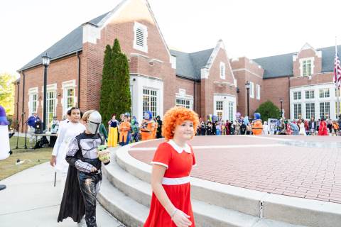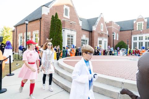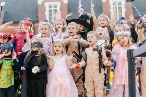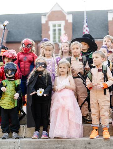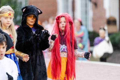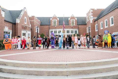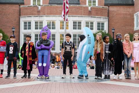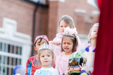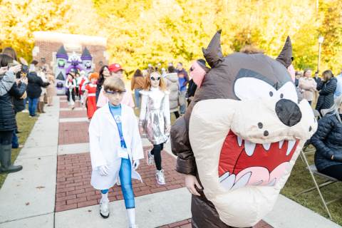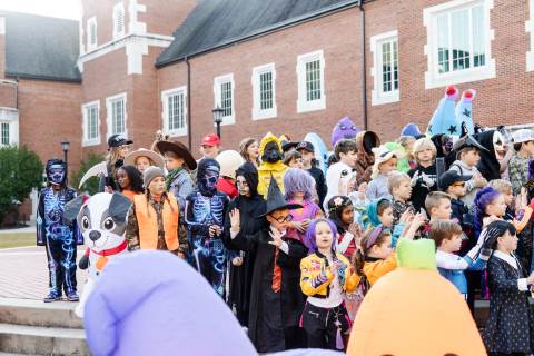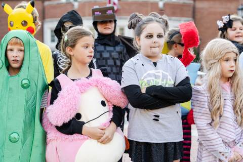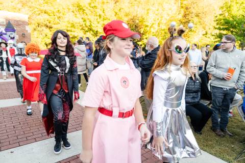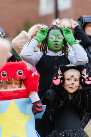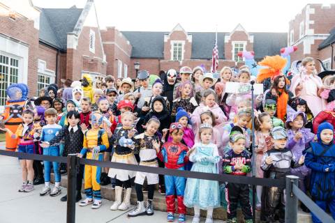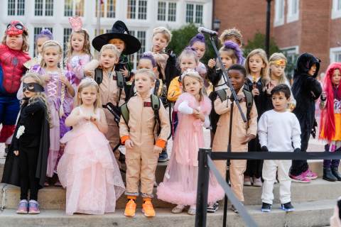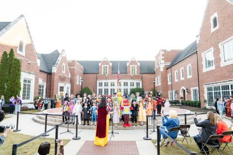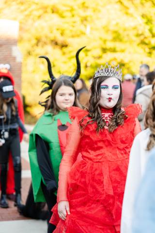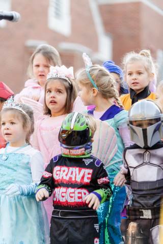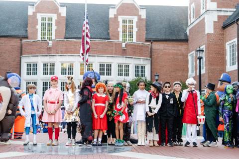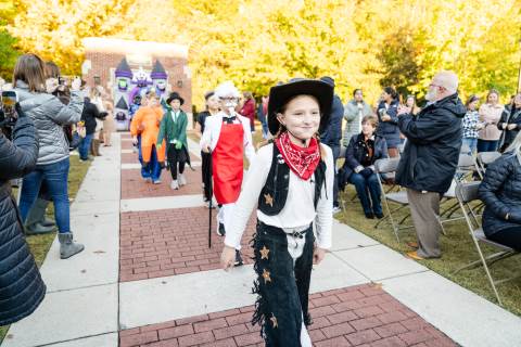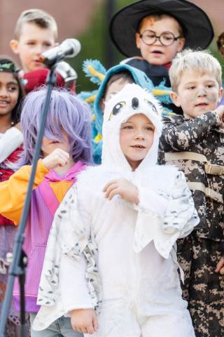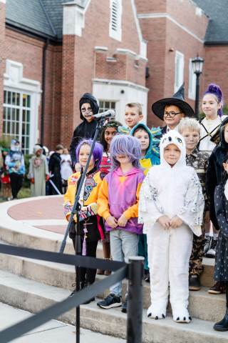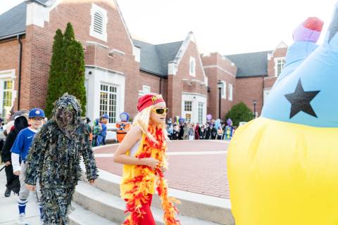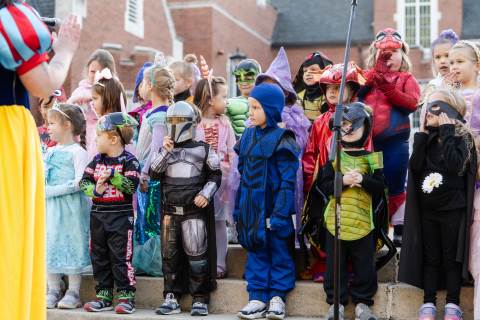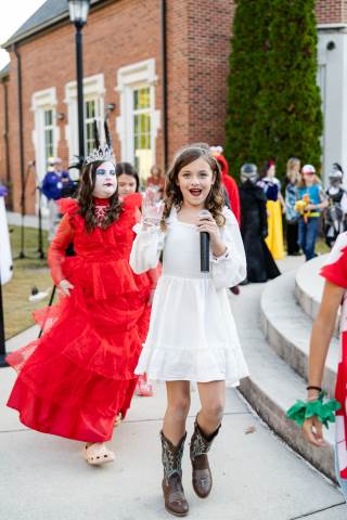 Students in grades pre-K to 5 show off their Halloween costumes at the annual parade before advisory groups representing grades 6-8 perform their skits for parents and special guests.