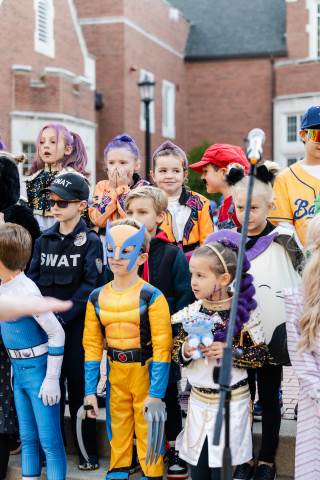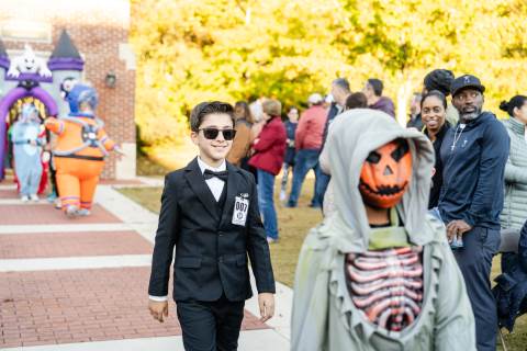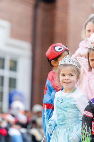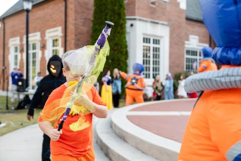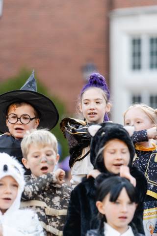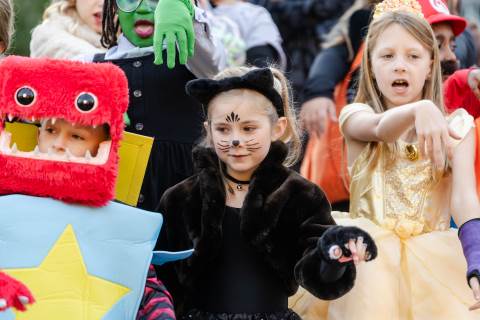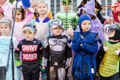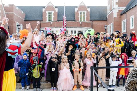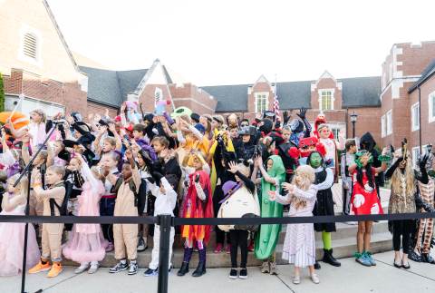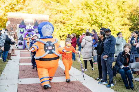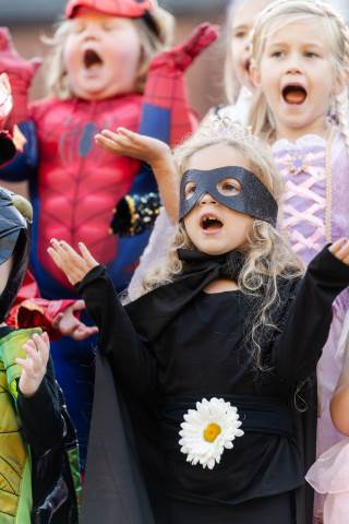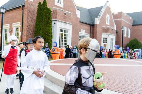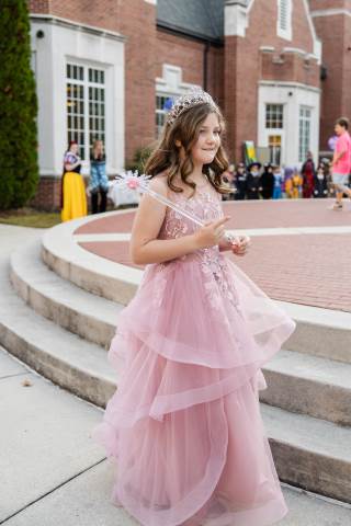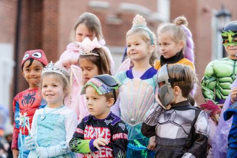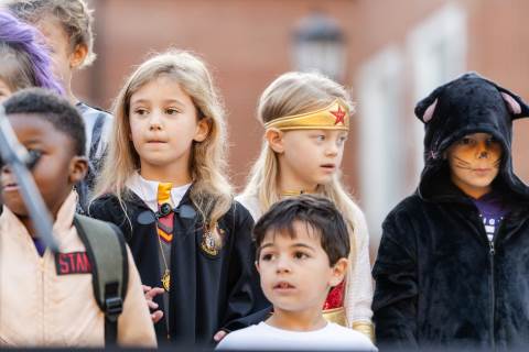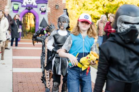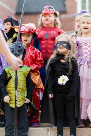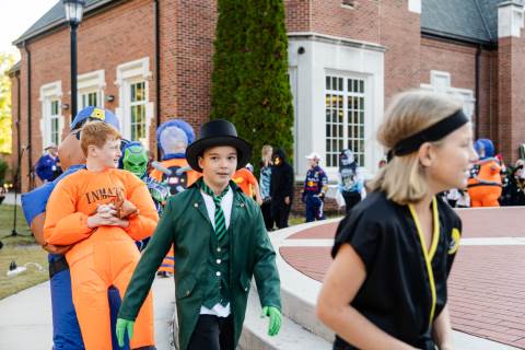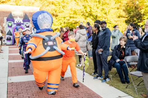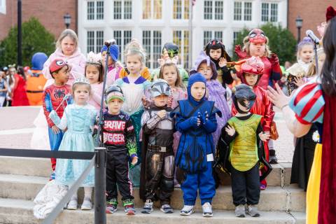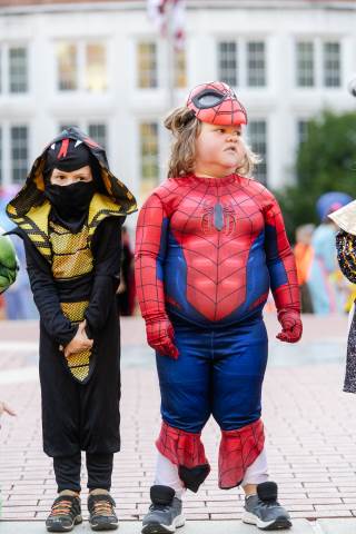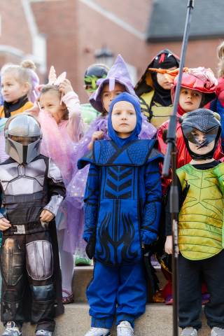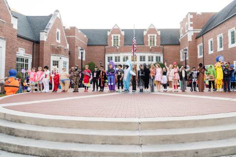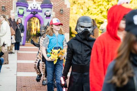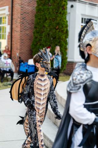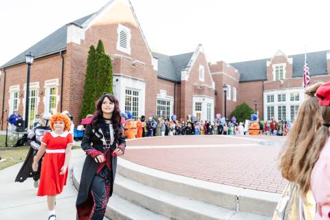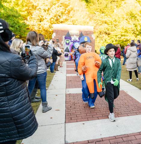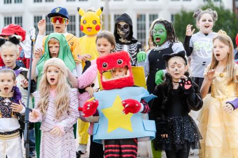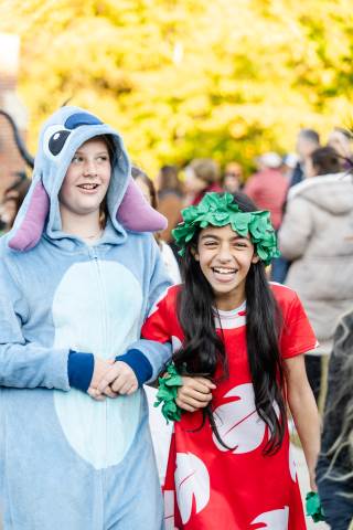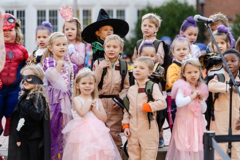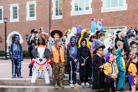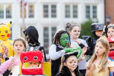 Students in grades pre-K to 5 show off their Halloween costumes at the annual parade before advisory groups representing grades 6-8 perform their skits for parents and special guests.