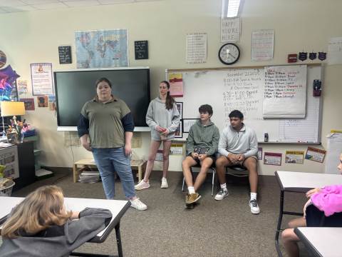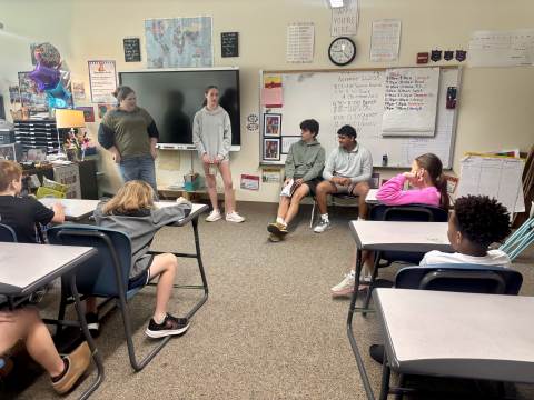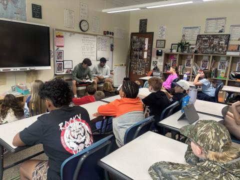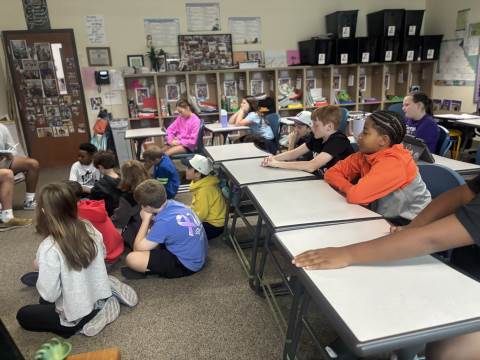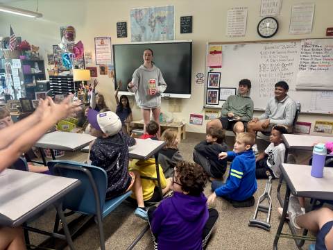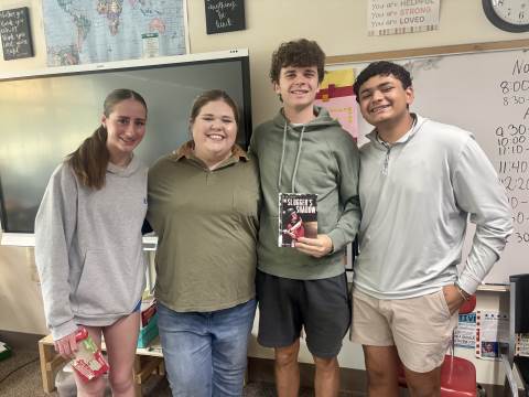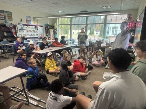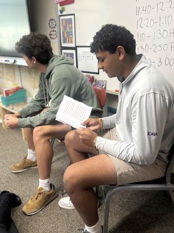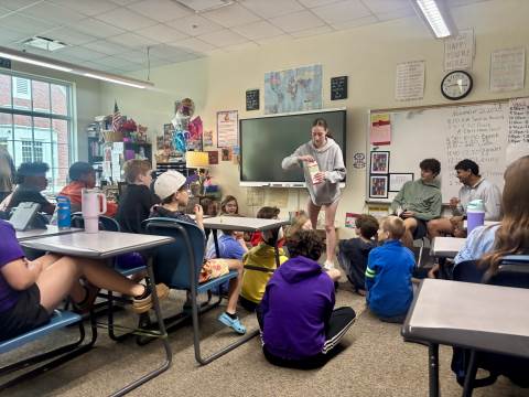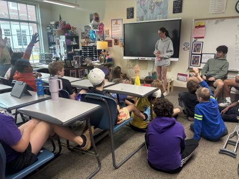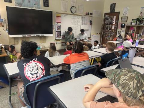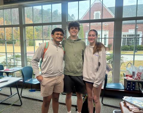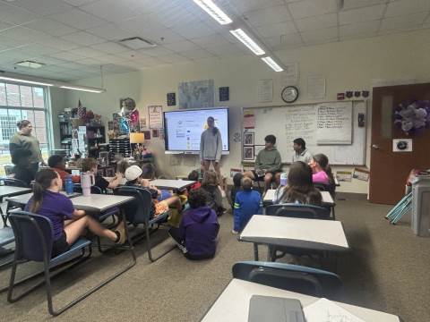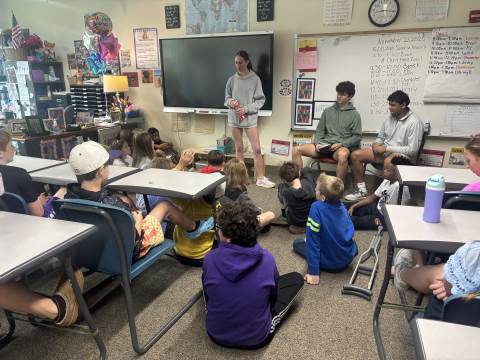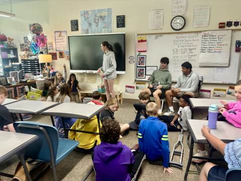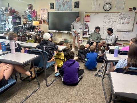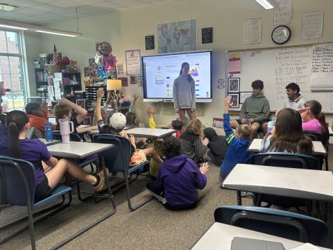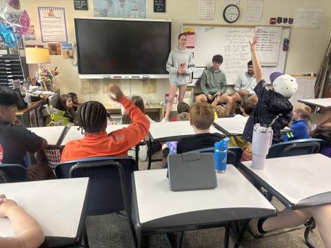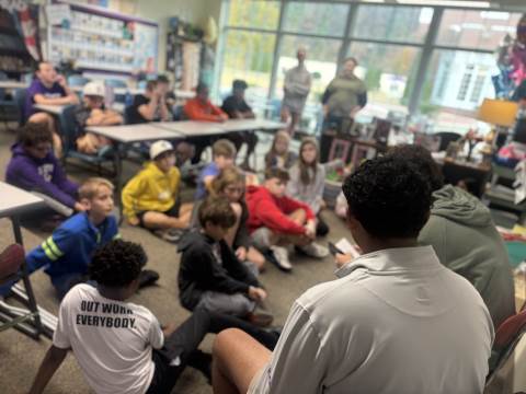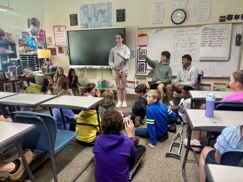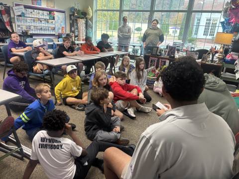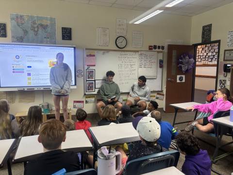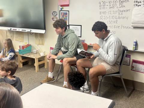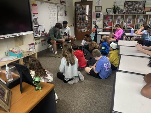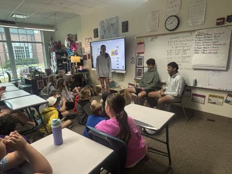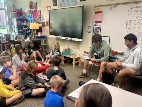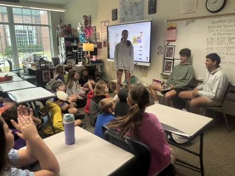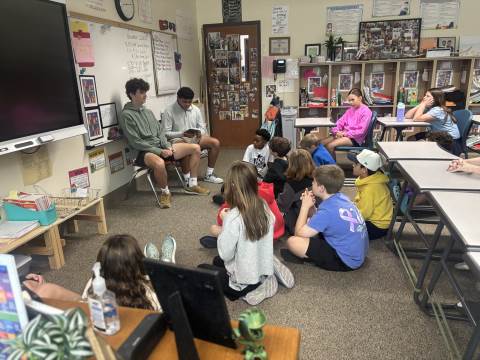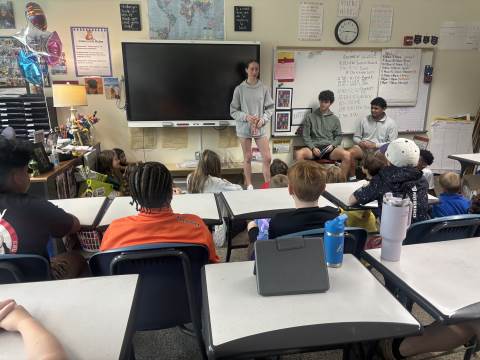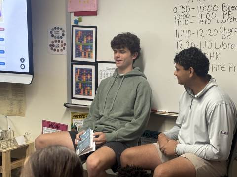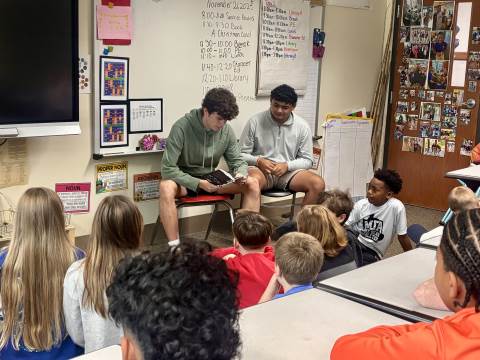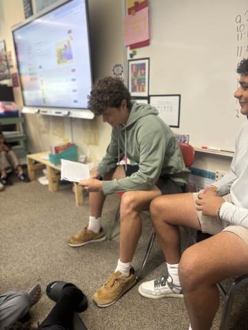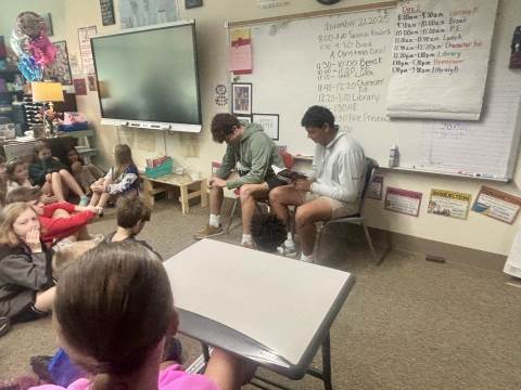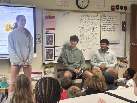 As part of her Senior Ventures Project, "The Power of Reading," senior Sophie Piller facilitated a special visit to the fifth grade with fellow seniors, Murray Ellington and Jaylen Patel. The seniors talked about some of their favorite books with the fifth-graders, and then Murray and Jaylen read a few chapters of "The Slugger’s Shadow" by Bob Temple to the class.