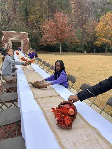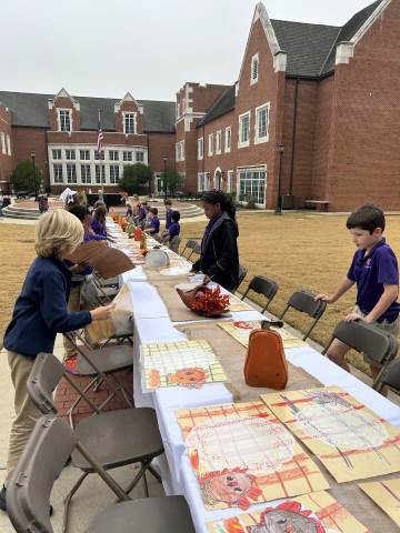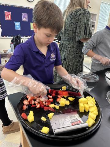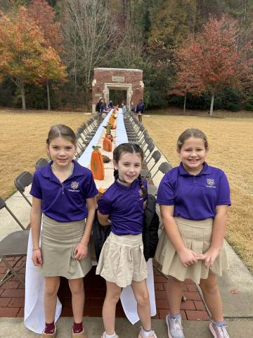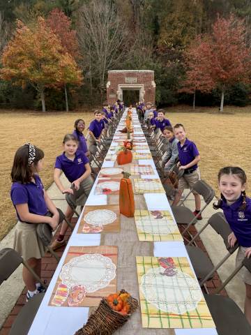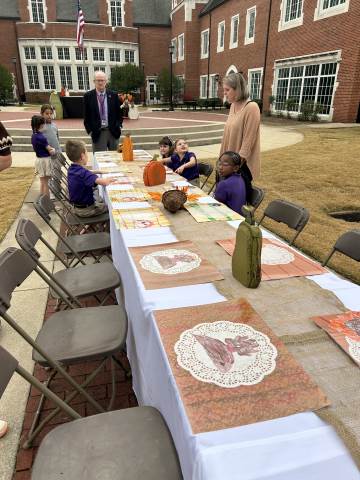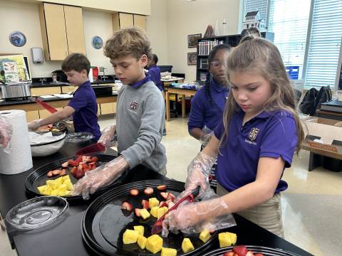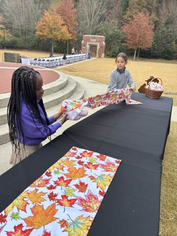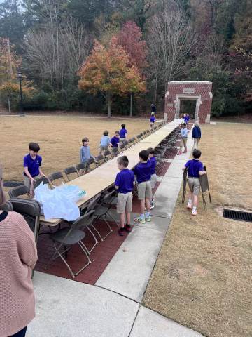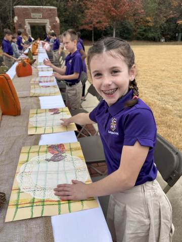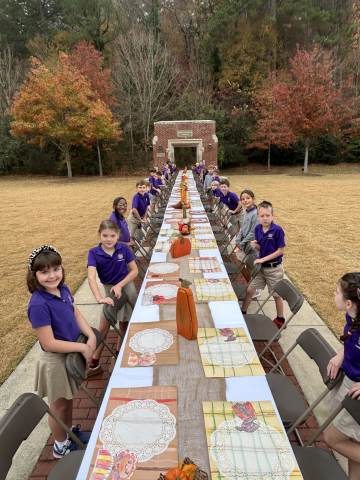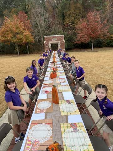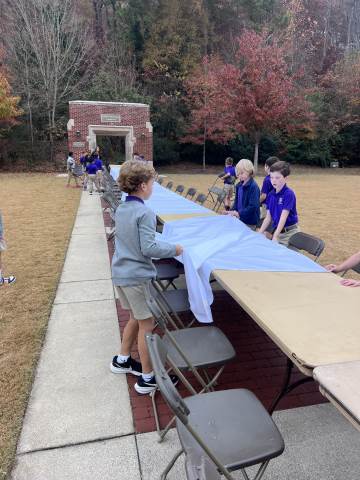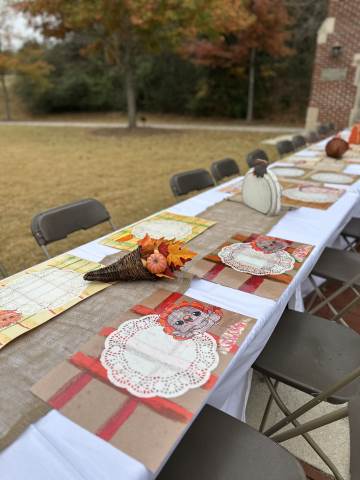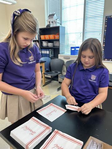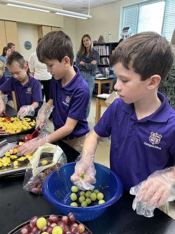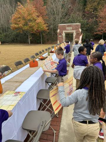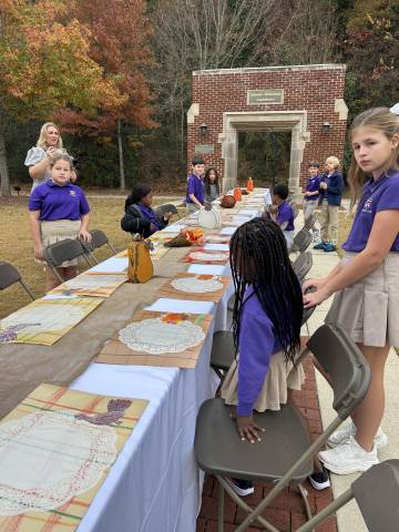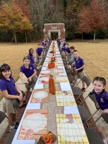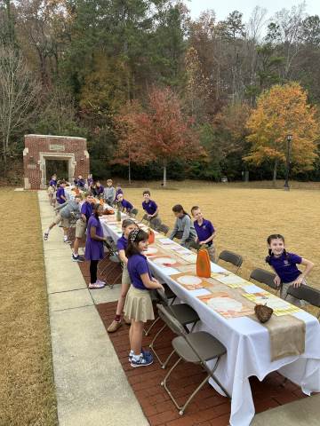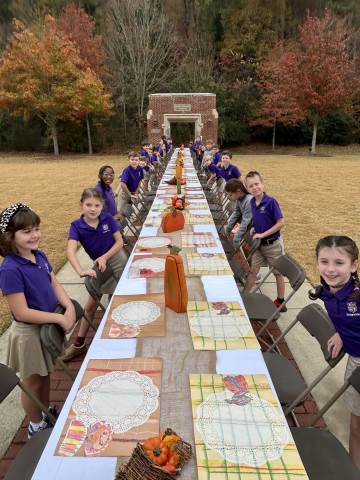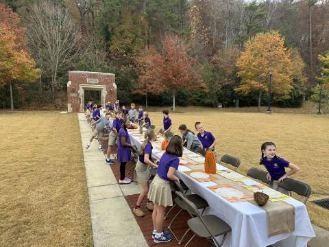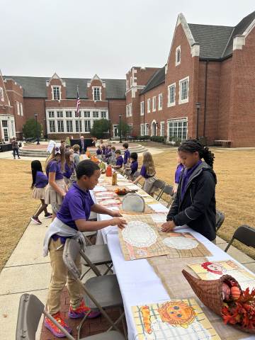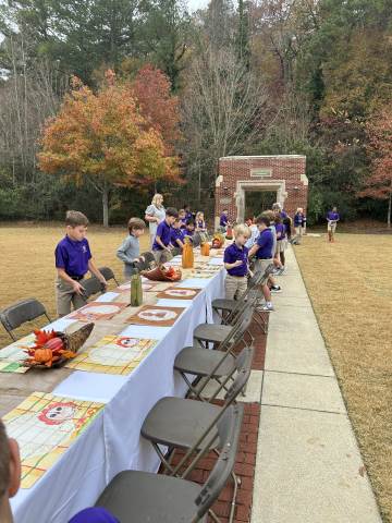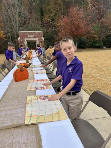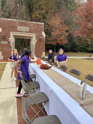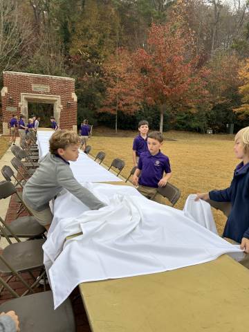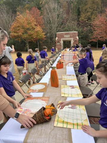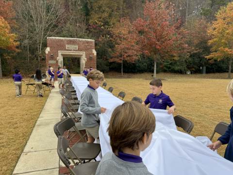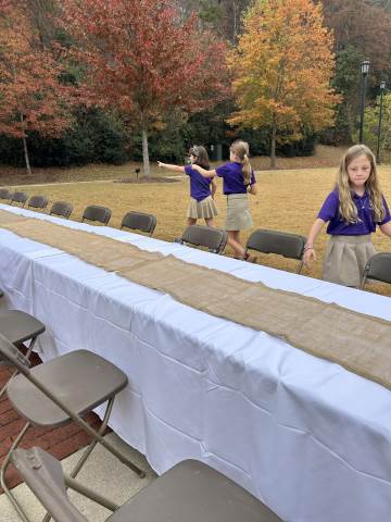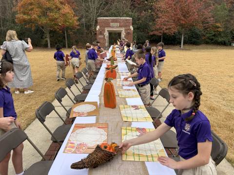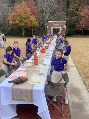 Third-graders worked with several supportive parents to prepare for our annual Friendship Feast. Several crockpots of "friendship stew" were assembled, fruit was chopped for fruit salad, placemats were trimmed, and utensils were rolled and tied. On the morning of the feast we set up tables and chairs, put out tablecloths, and decorated the tables with placemats.