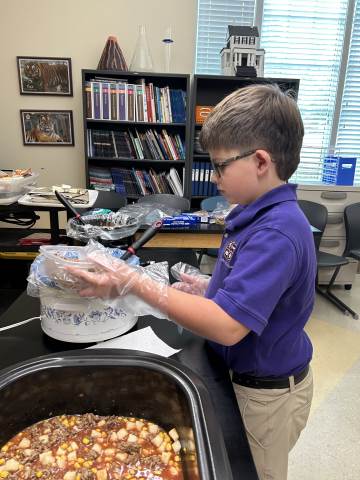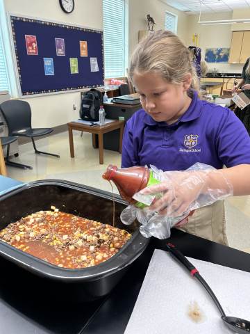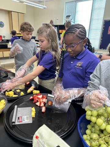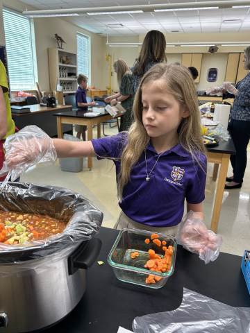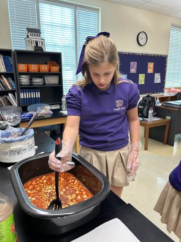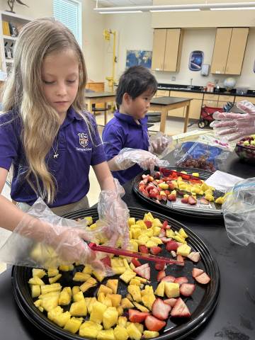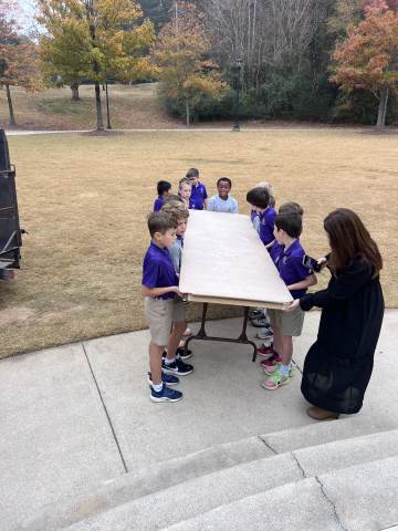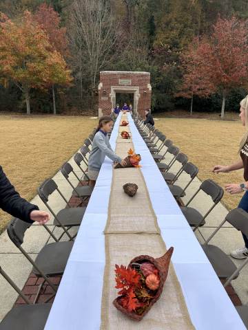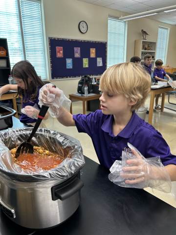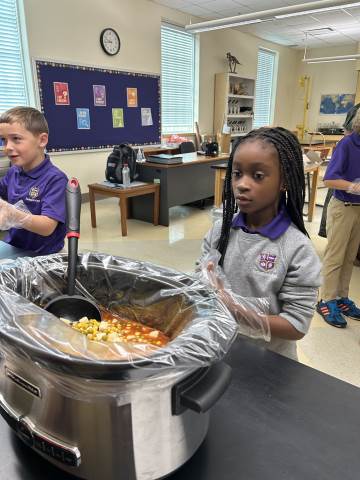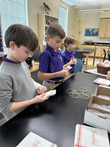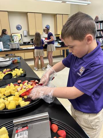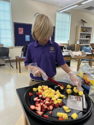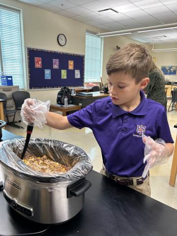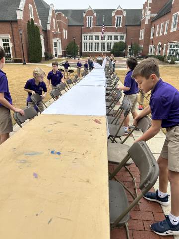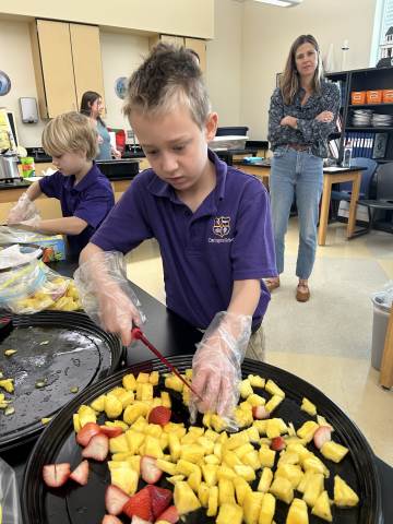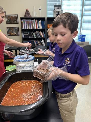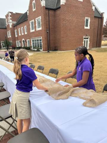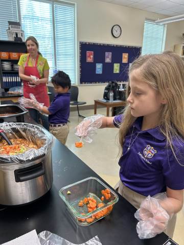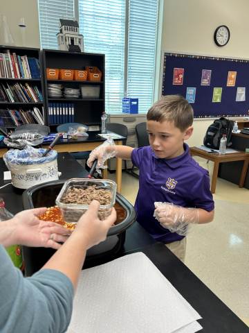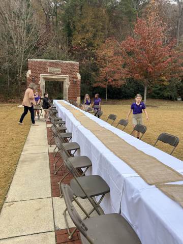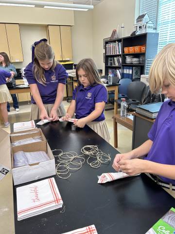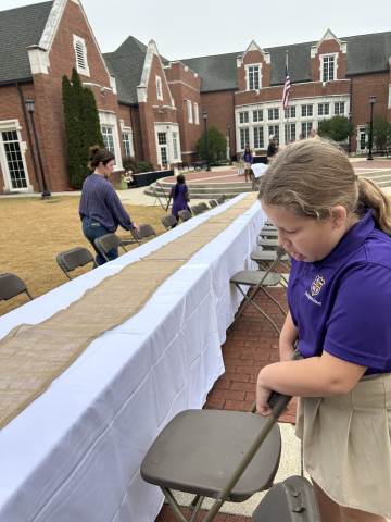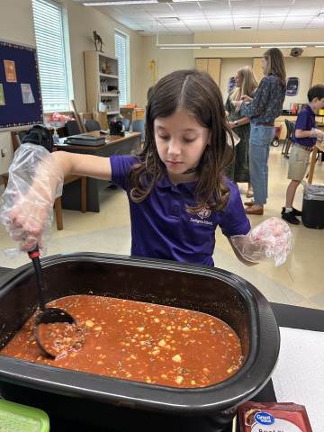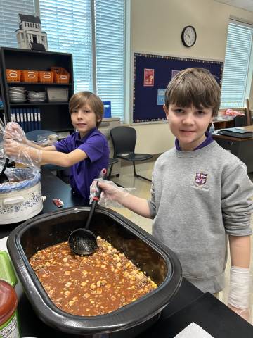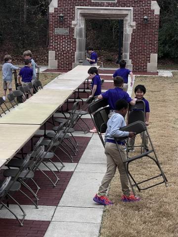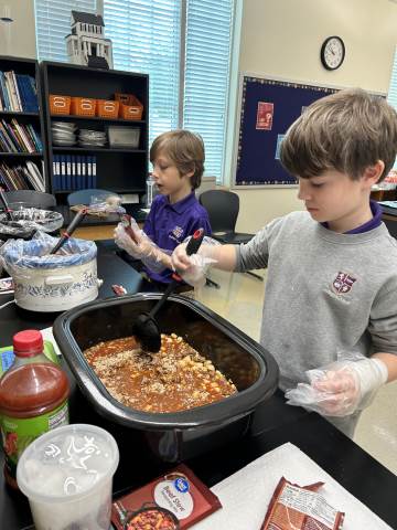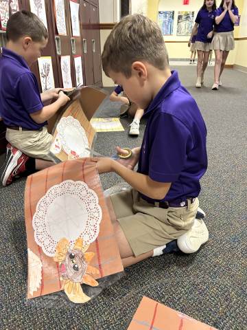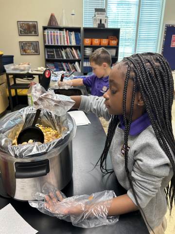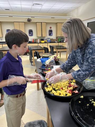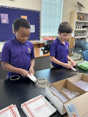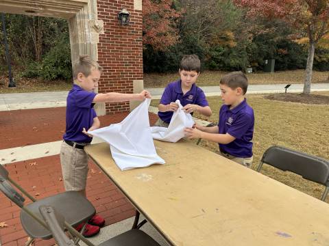 Third-graders worked with several supportive parents to prepare for our annual Friendship Feast. Several crockpots of "friendship stew" were assembled, fruit was chopped for fruit salad, placemats were trimmed, and utensils were rolled and tied. On the morning of the feast we set up tables and chairs, put out tablecloths, and decorated the tables with placemats.
