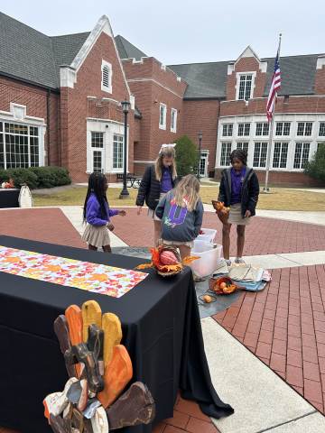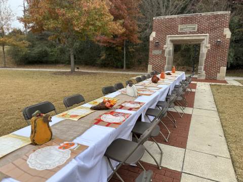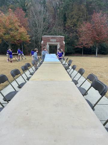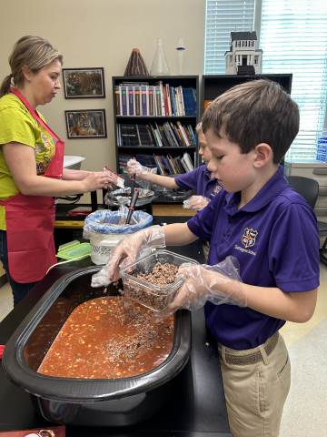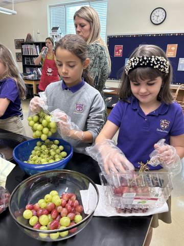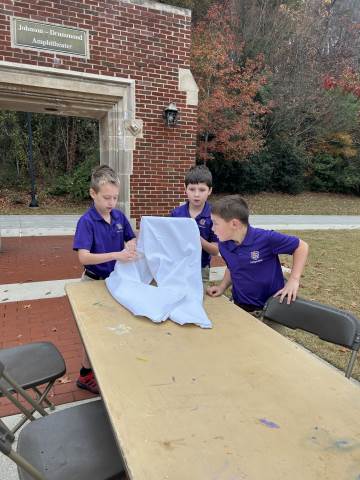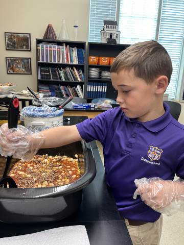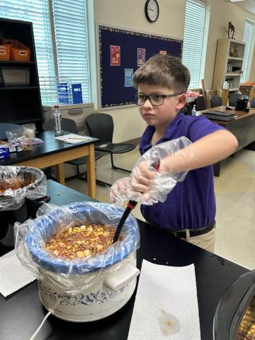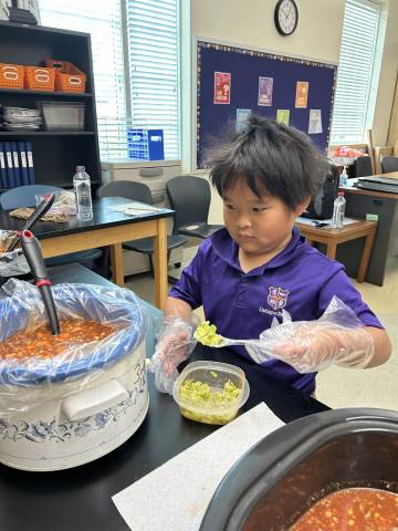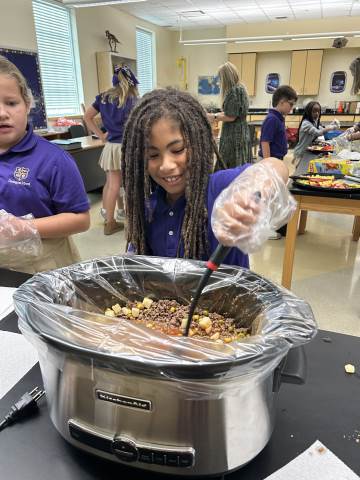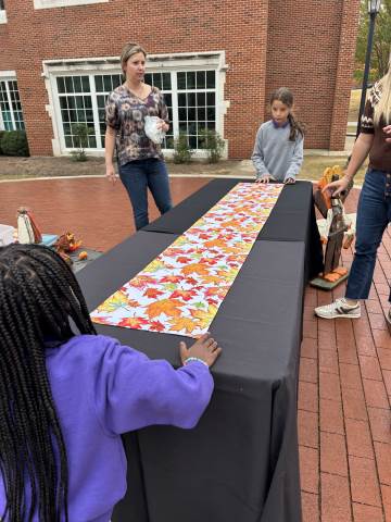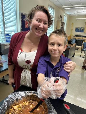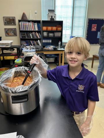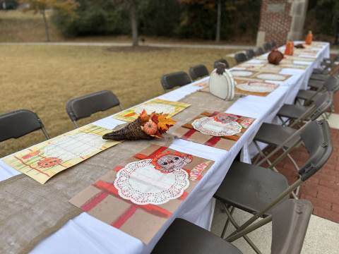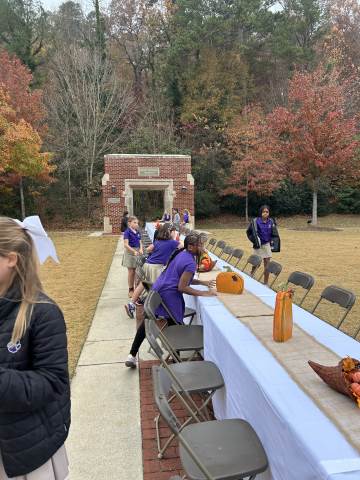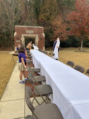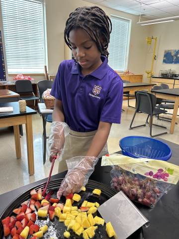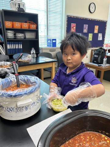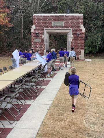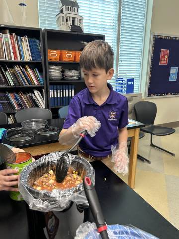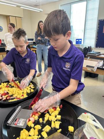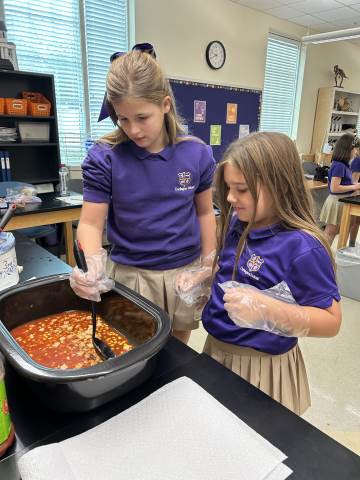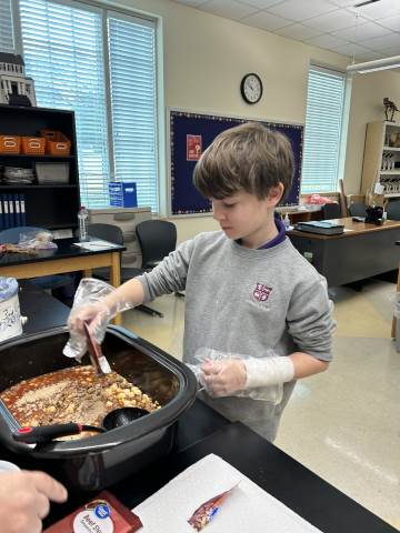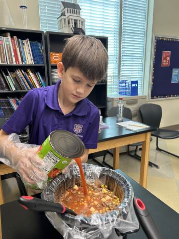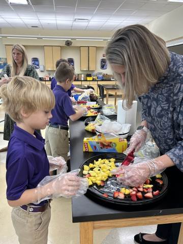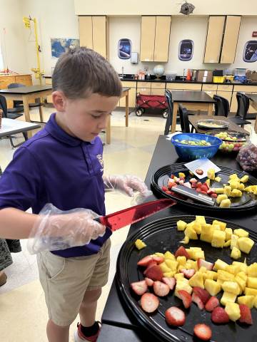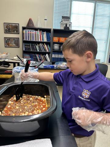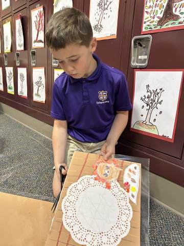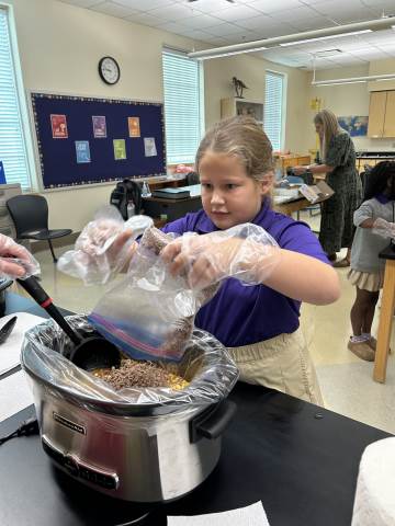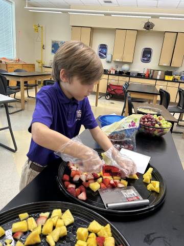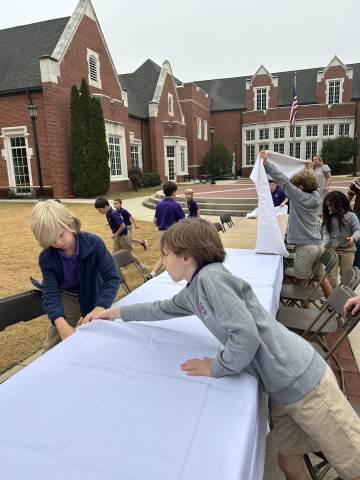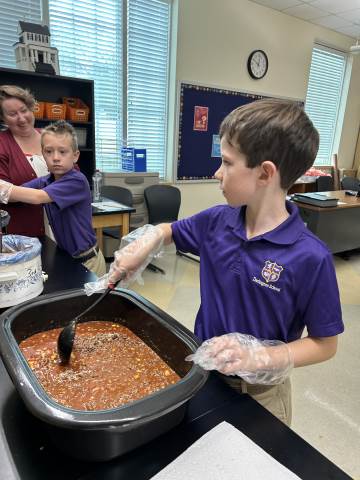 Third-graders worked with several supportive parents to prepare for our annual Friendship Feast. Several crockpots of "friendship stew" were assembled, fruit was chopped for fruit salad, placemats were trimmed, and utensils were rolled and tied. On the morning of the feast we set up tables and chairs, put out tablecloths, and decorated the tables with placemats.