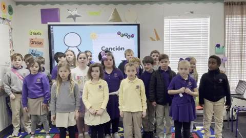 Second grade sings the popular song "Head, Shoulders, Knees and Toes" in Spanish from memory.