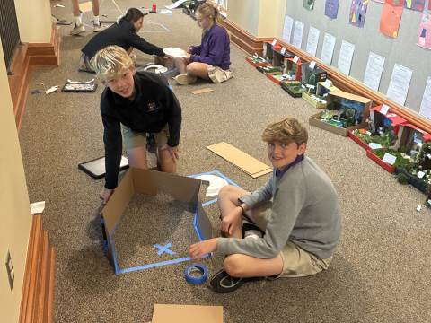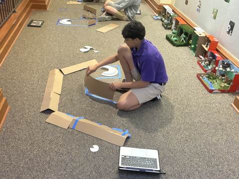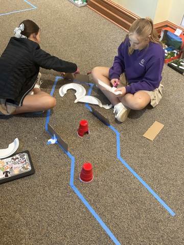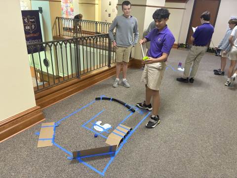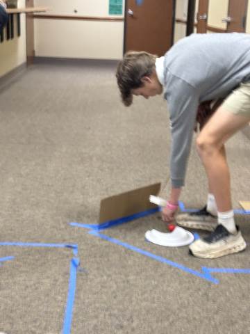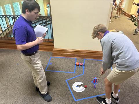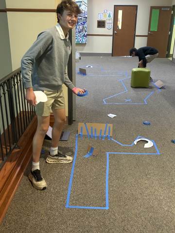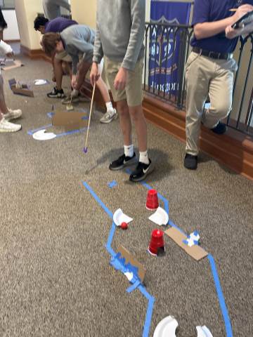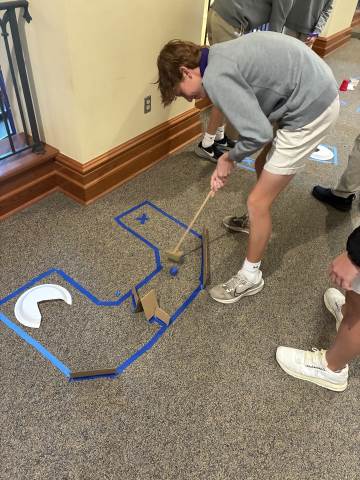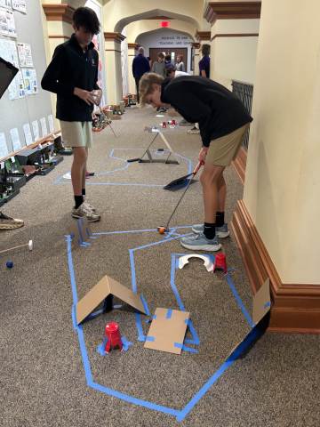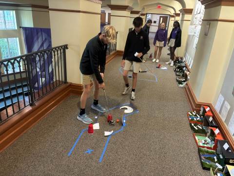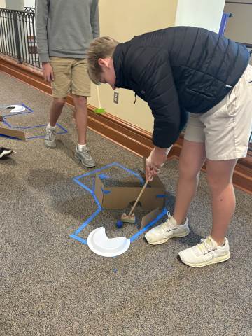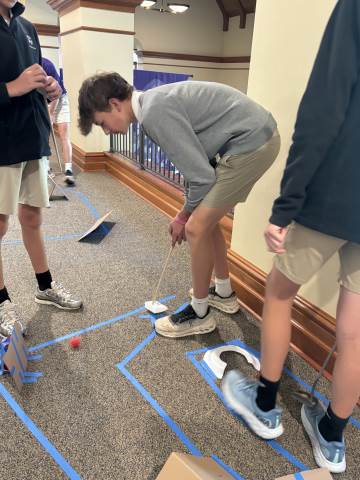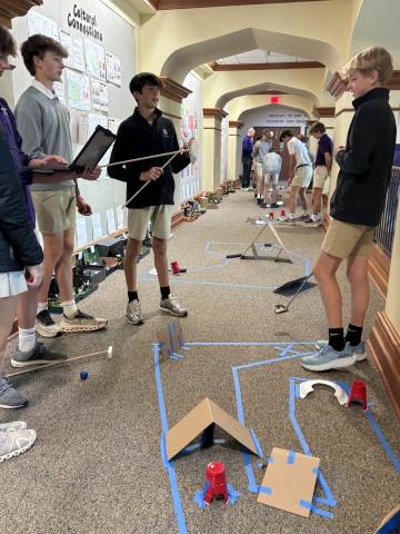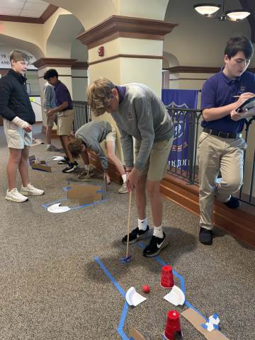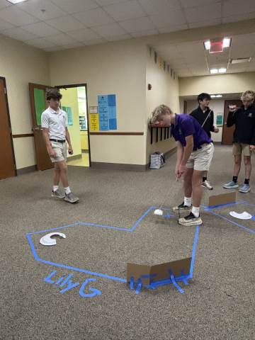 Students in Mr. Eberhart’s eighth-grade Algebra 1 Honors class utilized their piecewise function skills to design miniature golf courses. Initially, they created their courses using a graphing program. Subsequently, they had the opportunity to construct and play with their courses alongside their peers.
