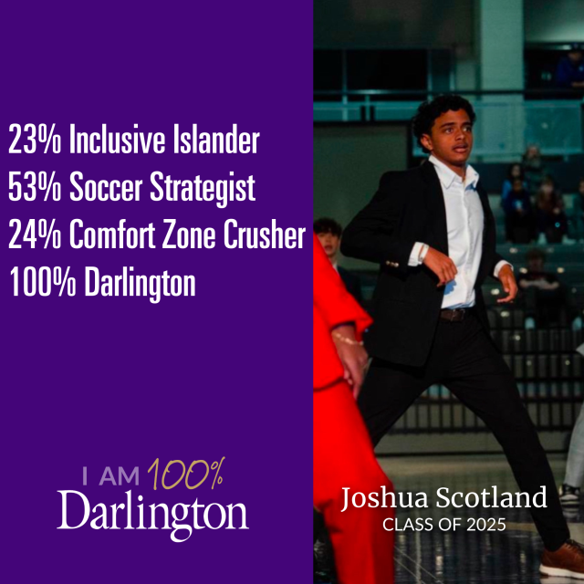 A Darlington student is made up of many things. None of which is average. We help our students develop their interests, passions and pursuits, because we believe every individual has something to contribute. We also believe that only when you're 100% you, are you 100% Darlington.