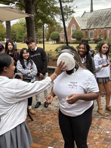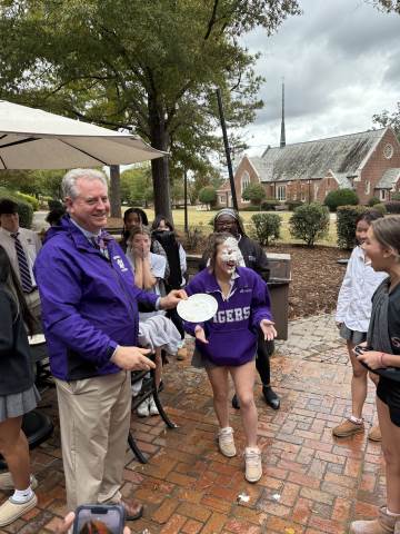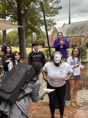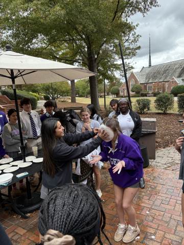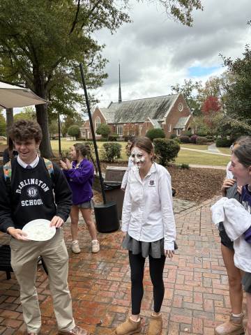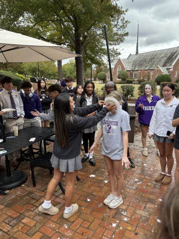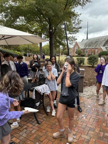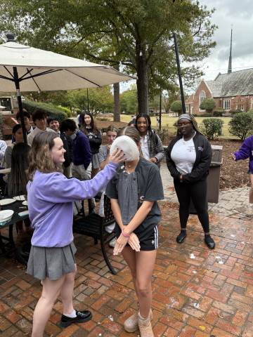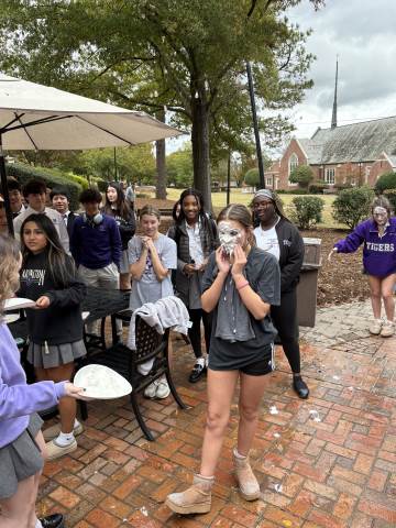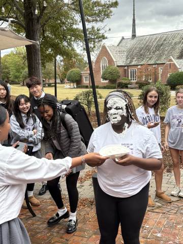 The senior cheerleaders participated in "Silent Senior" for Senior Week. If someone caught them talking, then they got to take their clothespin. At the end of the day, anyone who got a clothespin was able to pie a Senior during club period.